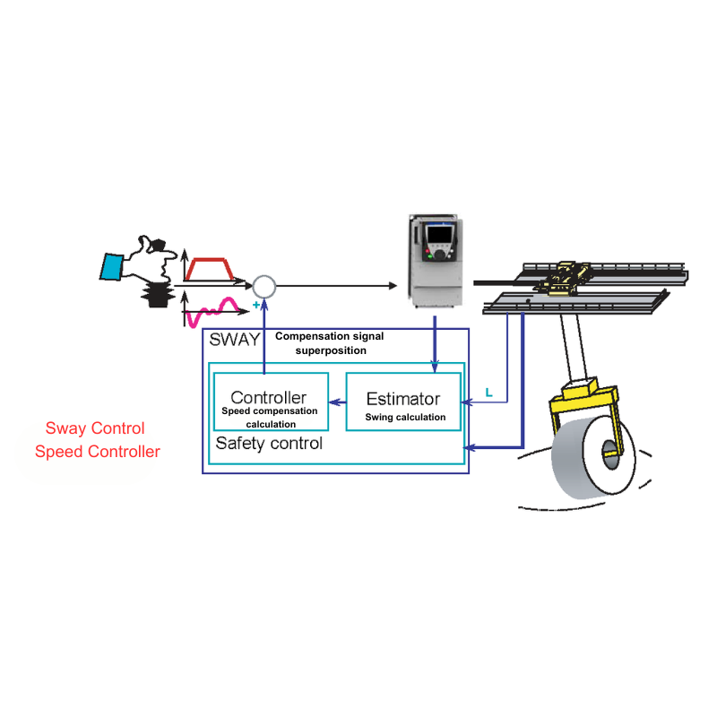 When the operator issues a command, the electronic sway control system monitors the pendulum length and initial speed in real-time. It then calculates the synthesized speed for swing suppression according to a pre-set mathematical model and sends it to the inverter, thereby achieving the sway control?and making the operation safer.